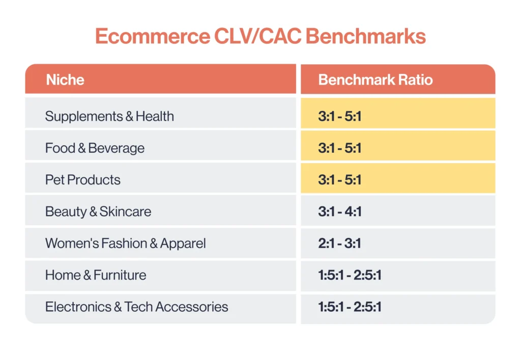 For ecommerce, a healthy CLV/CAC ratio is at least 3:1.